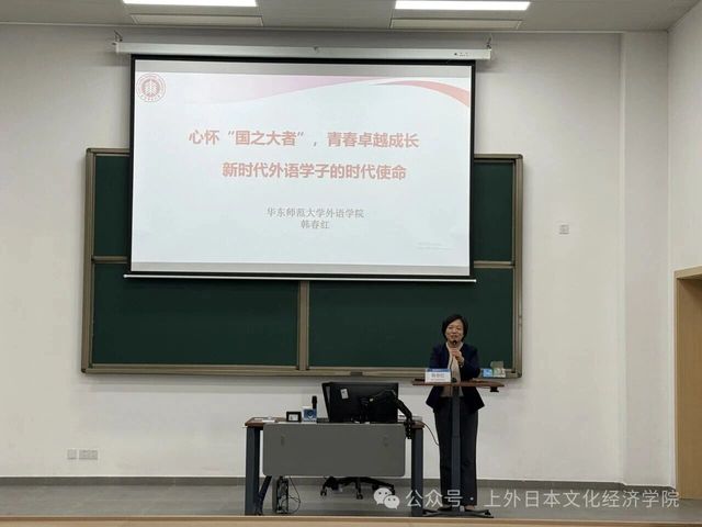 2026年4月2日,日本文化经济学院分党校第九期入党积极分子培训班专题党课暨“观今学史,明德日新”系列讲座第十七讲成功举办。华东师范大学外语学院党委书记、教育学博士韩春红老师以“新时代外语学子的时代使命”为主题,结合国家战略、历史脉络与鲜活案例,深入解读外语学科的时代价值,为各位学子明晰成长方向与使命担当。