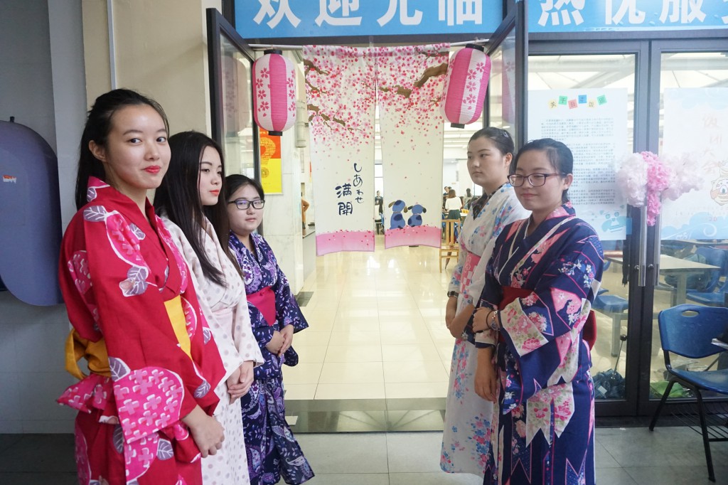 抱着一种期待的心情,我走进食堂,穿过婀娜的和服少女们,映入眼帘的是一个高高的鸟居上挂着小小的灯笼,一旁盛开着美美的樱花,一股浓浓的和式气息迎面扑来,清新且舒适,我的嘴角不禁微微上扬。