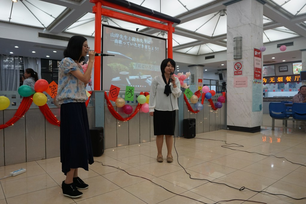我们可爱的外教老师山岸先生和铃木先生在全体同学的打节拍声中演唱了「にじいろ」,山岸大姐姐和铃木小姐姐真的好可爱啊