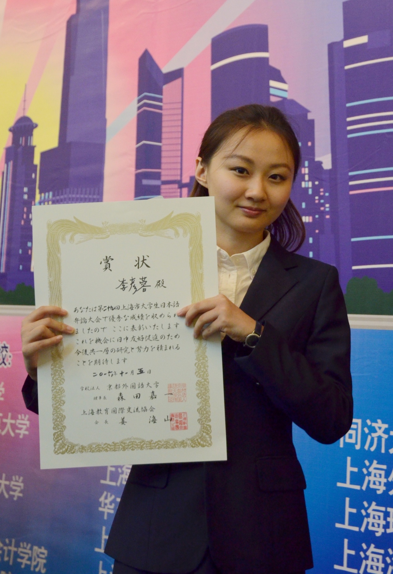 我校日本文化经济学院本科四年级李彦蓉同学在徐旻老师、外籍专家山岸老师的悉心指导下,凭借优秀的日语表达能力,敏捷的思维和应变能力在20名参赛选手中表现优秀,最终获得第三名,充分展示了上外学生的风采,体现了我校日语专业教学的优异水平,也是上外日语专业整体实力的真实写照。第一名和第二名分别为上海财经大学和华东师范大学的选手。李彦蓉同学将于明年初和另外两位获奖同学一起应邀赴日本参加为期一周的交流访问活动。