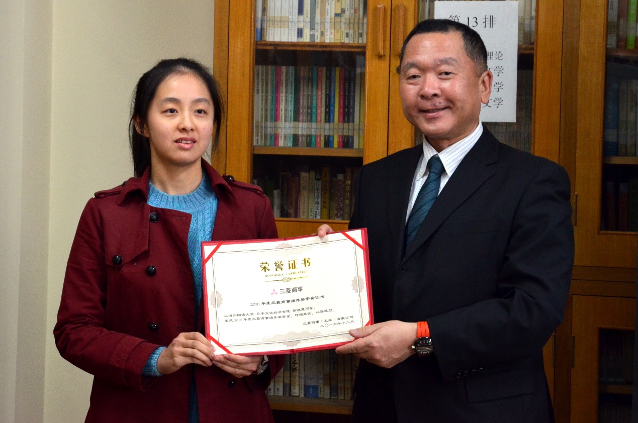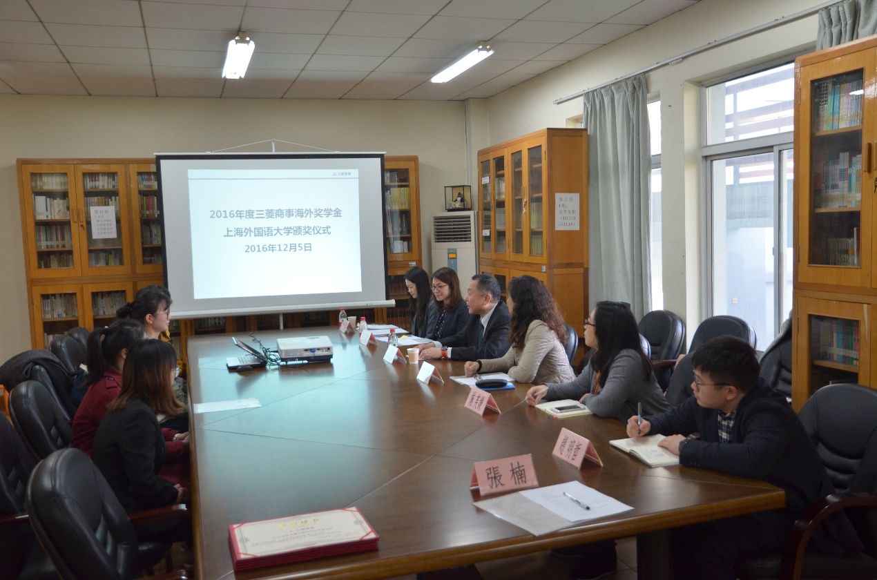 2016年12月5日下午,上海外国语大学2016年度日本三菱商事海外奖学金颁奖仪式在我校松江校区举行。此次颁奖仪式由日本文化经济学院与日本三菱商事(上海)有限公司共同举办。三菱商事(上海)有限公司平井康光总经理、人事总务部王铭部长,我院许慈惠院长及辅导员老师出席了颁奖仪式。