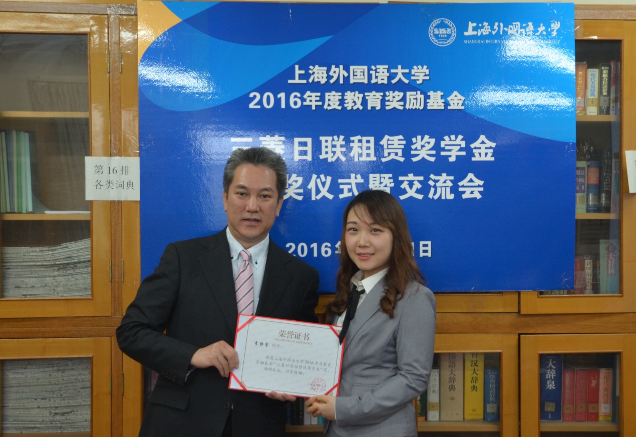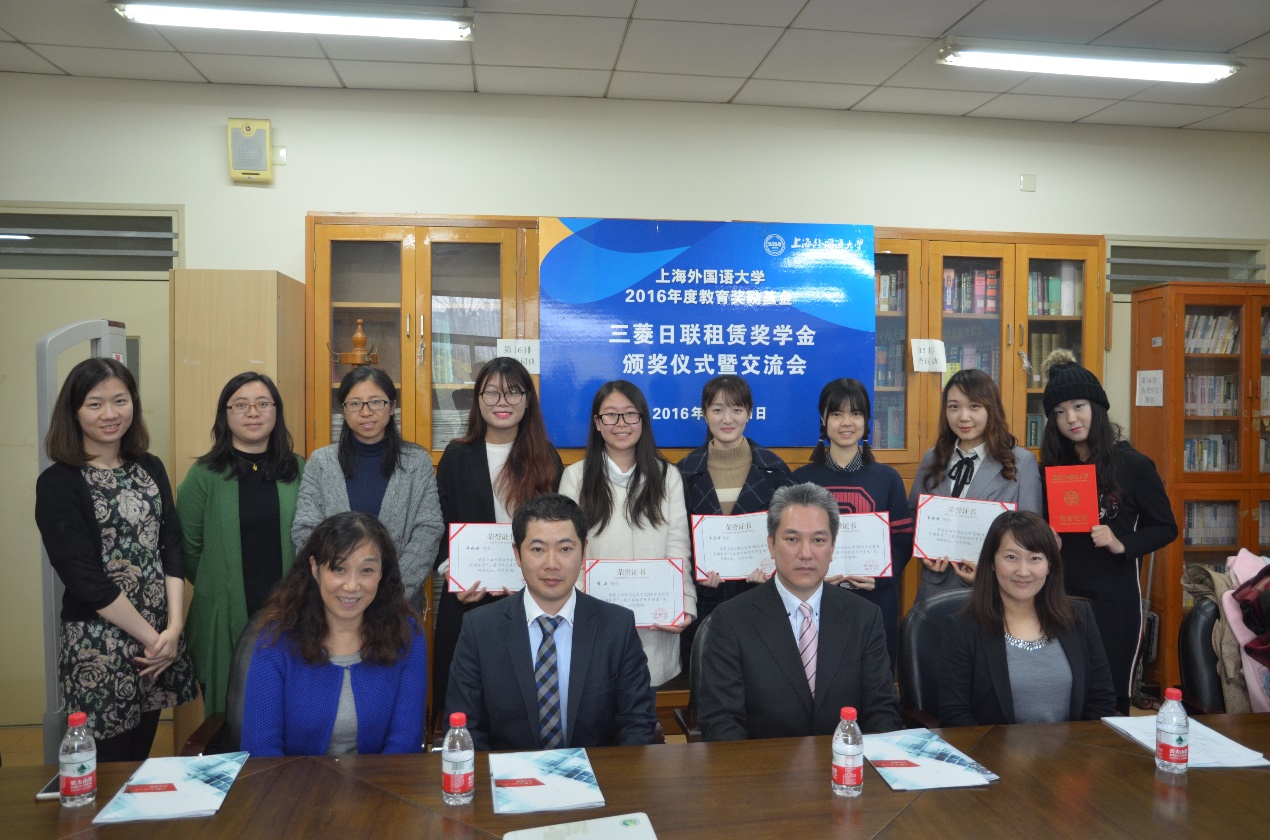 2016年12月21日下午,上海外国语大学2016年度教育奖励基金三菱日联租赁奖学金颁奖表彰仪式暨交流会在我校松江校区日语学院举行。此次颁奖表彰交流会由校教育发展基金会和日本文化经济学院共同举办。日本文化经济学院院长许慈惠教授,三菱日联融资租赁株式会社人事部副部长中村圭吾先生、室长谷口麻衣子女士,以及三菱日联融资租赁(中国)有限公司管理部高级经理中塚笃先生等出席了颁奖仪式。