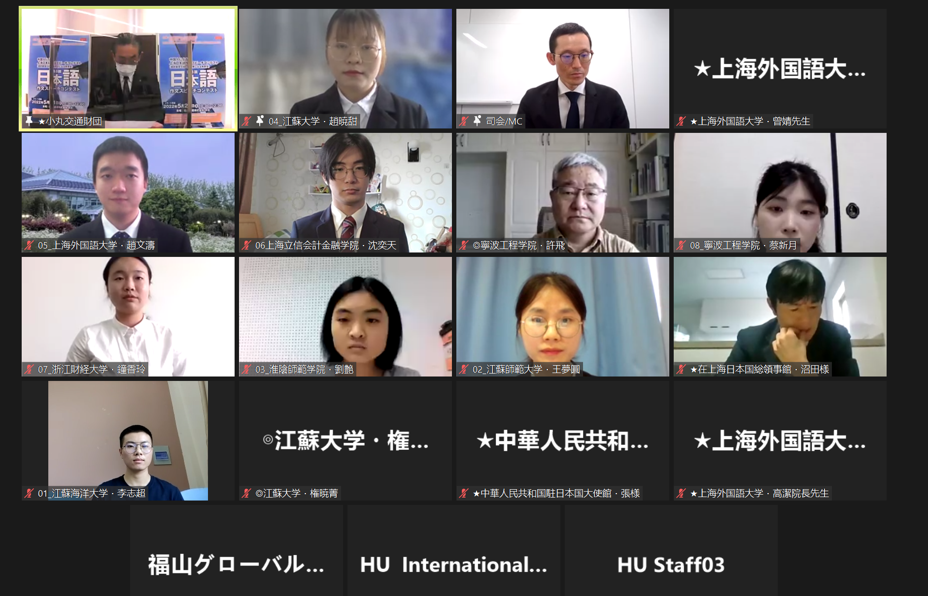 2022年5月21日,上海外国语大学与广岛大学、小丸交通财团联合主办的第八届中国大学生日语作文演讲大赛在云端隆重召开。中国驻日本大使孔铉佑、上海外国语大学校长李岩松、日本驻上海总领事赤松秀一、广岛大学校长越智光夫在大赛开幕式上视频致辞,上海外国语大学日本文化经济学院院长高洁、广岛大学北京研究中心所长本田义央、中国驻日本大使馆秘书张琼琼、日本驻上海总领事馆领事沼田真洋、小丸交通财团理事长小丸成洋、福山通运株式会社执行董事长原永寿等出席了本次大赛。