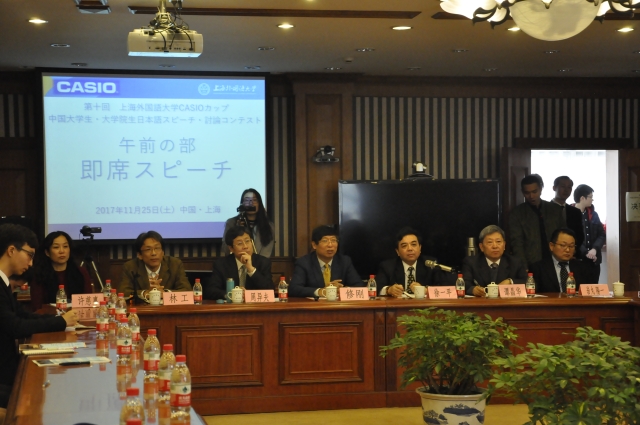 教育部高等学校外语专业教学指导委员会日语分委员会主任、天津外国语大学修刚教授、中国日语教学研究会会长、吉林大学周异夫教授、北京日本学研究中心徐一平教授、上海外国语大学谭晶华教授、许慈惠教授、上海外国语大学外籍专家林工老师莅临了决赛现场并担任评委。卡西欧(中国)贸易有限公司岩丸阳一副总经理也作为颁奖嘉宾莅临现场。赛前,谭晶华教授、周异夫教授和岩丸阳一副总经理先后发表致辞,表达了对此次赛事的高度重视和对参赛选手的殷切期望。