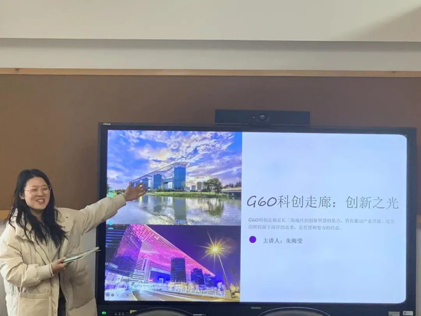 首先,由博士生朱海莹和支部组织委员祝扬烨两位同志进行党课领学。朱海莹同志从五个方面为同志们呈现了一个立体的G60科创走廊,分别是走廊背后的故事、科创走廊的脉搏、未来的发展愿景、企业家的智慧、创新政策的引导,其中特别强调了党的领导在建设G60科创走廊过程中发挥着重要作用。党员们以身作则,发挥先锋模范作用,为科技创新贡献自己的智慧和力量。党的领导为G60科创走廊提供了坚强的政治保障,为科技创新事业注入了强大的动力。
