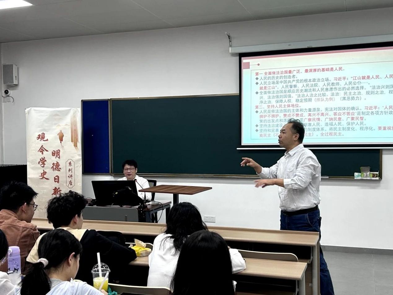 随后,张海斌教授结合生动的事例和扎实的法理,从“十一个坚持”角度为在座师生深入阐释了习近平法治思想的核心要义,即坚持党对全面依法治国的领导;坚持以人民为中心;坚持中国特色社会主义法治道路;坚持依宪治国、依宪执政;坚持在法治轨道上推进国家治理体系和治理能力现代化;坚持建设中国特色社会主义法治体系;坚持依法治国、依法执政、依法行政共同推进,法治国家、法治政府、法治社会一体建设;坚持全面推进科学立法、严格执法、公正司法、全民守法;坚持统筹推进国内法治和涉外法治;坚持建设德才兼备的高素质法制工作队伍;坚持抓住领导干部这个“关键少数”。