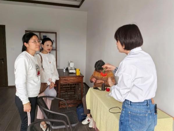 最后是学习制作非遗文化盘扣技艺。盘扣颜色绚丽多彩,外观多种多样,是中国独有的一门传统手工技艺。在袍、褂、衫、裙等服饰中,都能看到盘扣的影子。村民向同学们介绍了盘扣的发展文化,展示了众多花样的盘扣作品,并亲手指导同学们制作盘扣。此次盘扣制作学习活动让同学们体验劳动快乐、提高动手能力的同时,更加感受到了中华文化的博大精深。更重要的是,对非遗传承人的工匠精神充满了敬佩,深刻体会到了国家非物质文化遗产中所蕴含的劳动人民的智慧与创造精神。