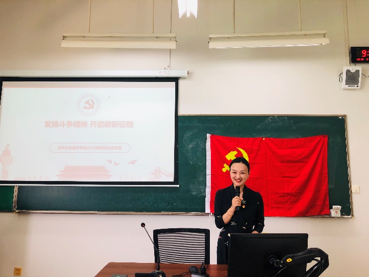 2019927日,日本文化经济学院2018级研究生党支部组织的发扬斗争精神,开启崭新征程主题党日在松江校区举行,活动由支部书记刘梦妤主持,学院党总支副书记刘飞出席并做了总结发言。