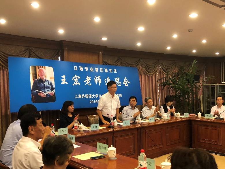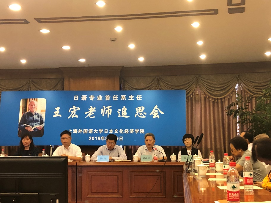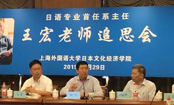 2019年9月29日上海外国语大学日本文化经济学院举办了上外日语专业首届系主任王宏老师追思会,共同缅怀王老师的丰功伟绩,学习他的崇高品德,激励当代日语人积极投身新时代中国特色社会主义事业,展望上外日院发展未来。上外日院党总支书记施桦主持追思会,上外党委常委副校长杨力、上外原常务副校长谭晶华、王宏老师之子王正、上外离退休工作处党总支书记顾蔚、上外日本文化经济学院院长高洁等人共同出席了追思会,讲述了王宏老师生前的故事与事迹,展现了王宏老师身上老革命家的风骨与高尚的道德品格。