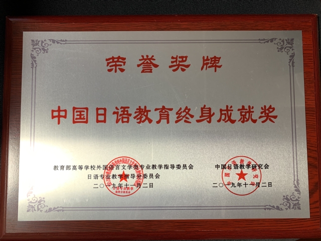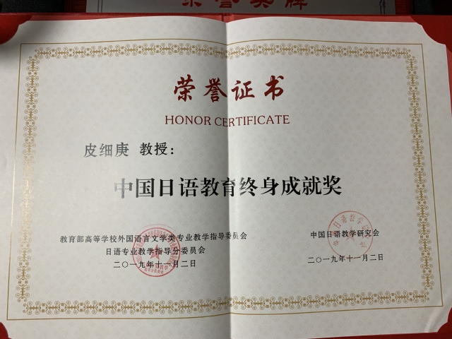 在2019年11月1-3日举行的中国日语教学研究会2019年度学术大会暨日本学研究国际研讨会上隆重举行了第二届“中国日语教育终身成就奖”颁奖典礼。该奖项由教育部高等学校外语专业教学指导委员会日语分委员会和中国日语教学研究会共同颁发,我校皮细庚教授获奖。迄今为止,全国共有九位日语教育界前辈获此殊荣,其中我校有三位,分别是王宏教授、谭晶华教授、皮细庚教授。