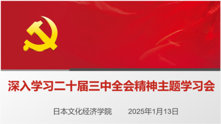 2025年1月13日,日本文化经济学院教工党支部召开党的二十届三中全会精神主题学习会。此次会议旨在深入学习贯彻党的二十届三中全会精神,通过开展党风廉政主题教育和师德师风警示教育,进一步加强师德师风建设,更好地培养高素质教师队伍。会议由教工党支部书记林彬主持,全体党员教师参加会议。作为教职工理论学习的一部分,学院其他教师列席会议。