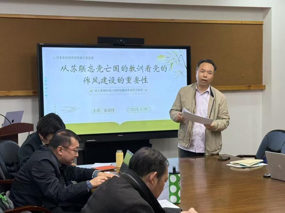 在前期部署和党委会、党政联席会开展学习的基础上,3月28日下午,日本文化经济学院教工党支部召开深入贯彻中央八项规定精神学习教育的首场党课。党课由学院党委书记张绍铎主讲。他首先向同志们大体介绍了《习近平关于加强党的作风建设论述摘编》一书的主要内容,然后以《从苏联忘党亡国的教训看党的作风建设的重要性》为题重点就该书第一章“党的作风建设关系人心向背,决定党和国家事业成败”的阐述展开。